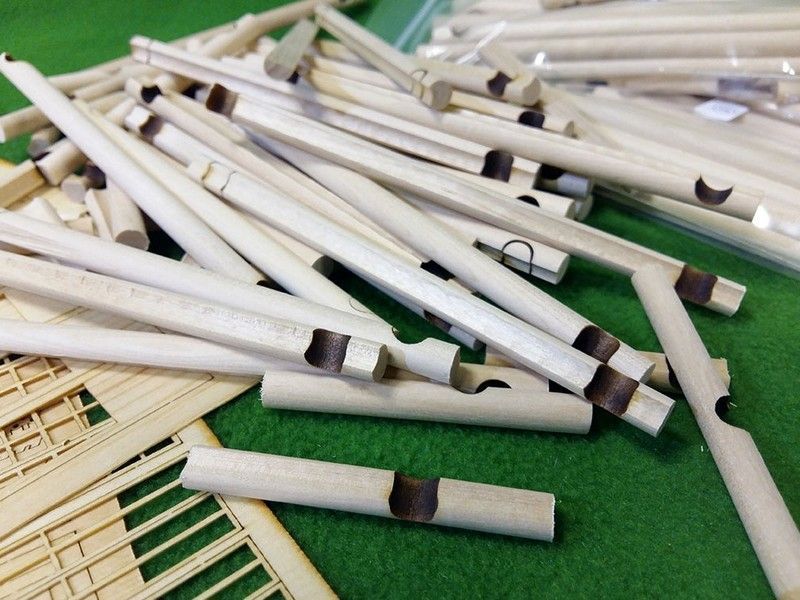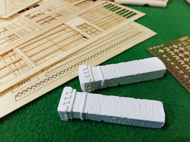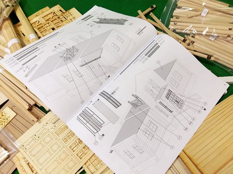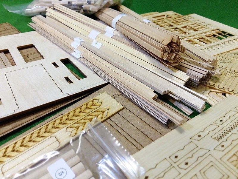 В наборе 5 пакетов с бревнами диаметром 8 мм, имеющих продольный паз (лежку) и уже прорезанные чашки. 16 листов лазерной резки из шпона 0,6, 1, 1,5 и 2 мм. Фототравление, пластик для окон и дверей. Фундамент выполнен из наборных элементов, вырезанных из МДФ. Основа переднего фасада с крыльцом - из фанеры 4 мм, которую предлагается обшить рейками.