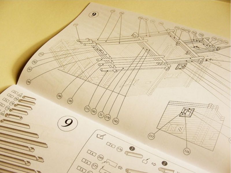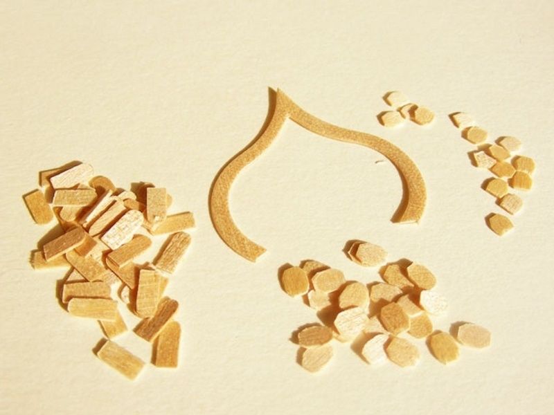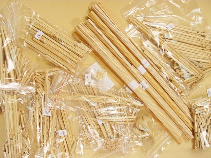 набор для для сборки: бревна с уже пропиленными пазами, детали фототравления для изготовления петель и дверных ручек, рейки для устройства крыш и полов, вырезанный лазером лемех, точеные детали маковок