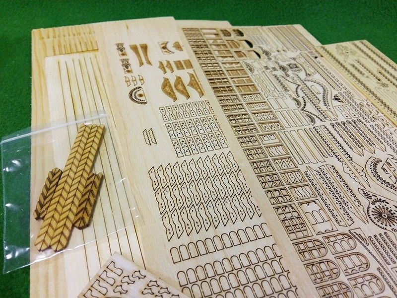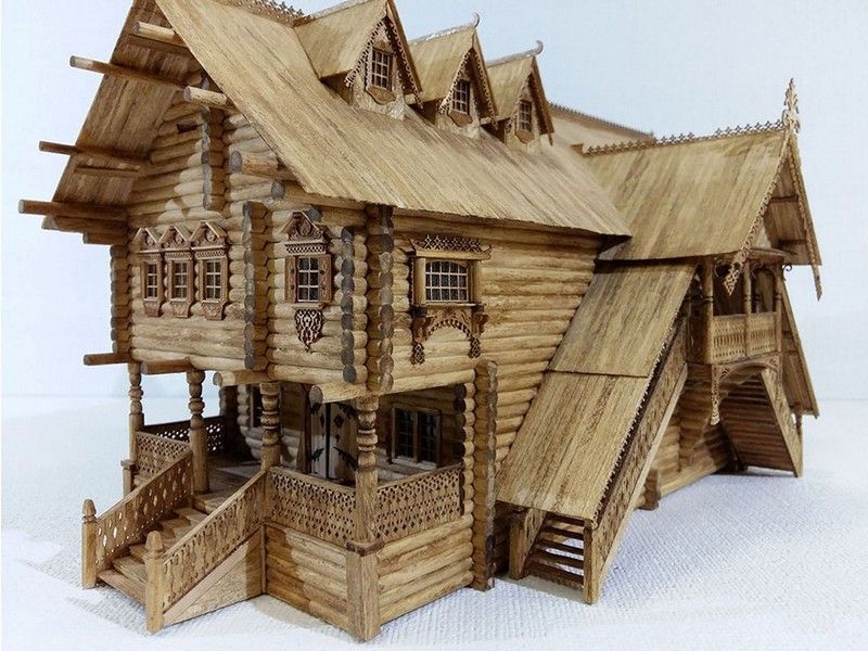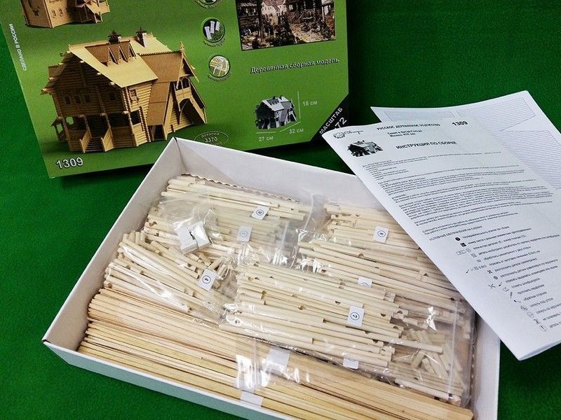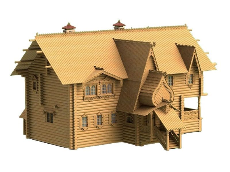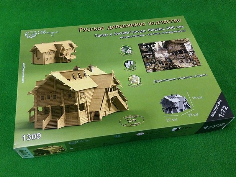Данный набор воссоздает терем из Китай-города в миниатюре. наборе Вы найдете все необходимые детали для сборки, в том числе бревна с уже пропиленными пазами, рейки для настила полов и устройства крыш, резные столбы, печные трубы из гипса, которые выглядят настолько реалистично, как если бы были сделаны из настоящего кирпича, а также большое количество резных деталей элементов украшений. Все двери в Тереме сделаны рабочими, на миниатюрных петлях из фототравления. Их можно открыть и заглянуть внутрь. Терем богато украшен резьбой - в этом наборе она двух видов - прорезная и рельефная.
