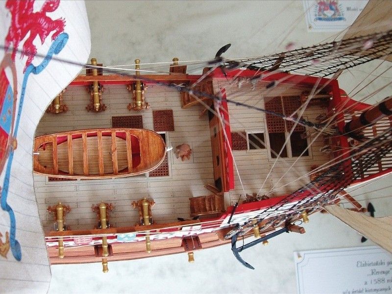 Галеон Revenge (Месть) ВМС Англии Елизаветинской эпохи был построен в Дептфорде и спущен на воду в 1577 году. Revenge был новым проектом в серии, так называемых “Race Build Galeon”. Вооружение галеона состояло из 46 орудий, водоизмещение было около 500 тонн и команда из примерно 250 человек. В 1588 году галеон становится флагманом эскадры сэра Френсиса Дрейка. Под его командованием он принимает участие в сражении в проливе Ла Манш, где ведет дуэль с испанским флагманом San Martin. Revenge получает около 40 прицельных попаданий, что вынуждает его покинуть поле боя.