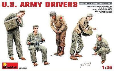 1/35 Американские армейские водители, 5 сборных пластиковых фигур (MiniArt 35180).В комплекте пластиковые детали для сборки пяти фигур со снаряжением. Средняя высота готовой фигурки 50 мм.