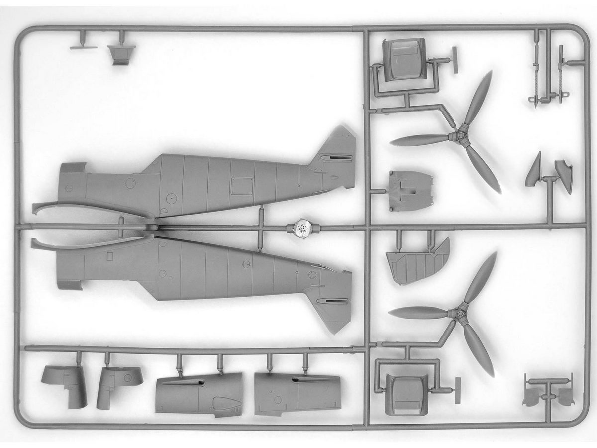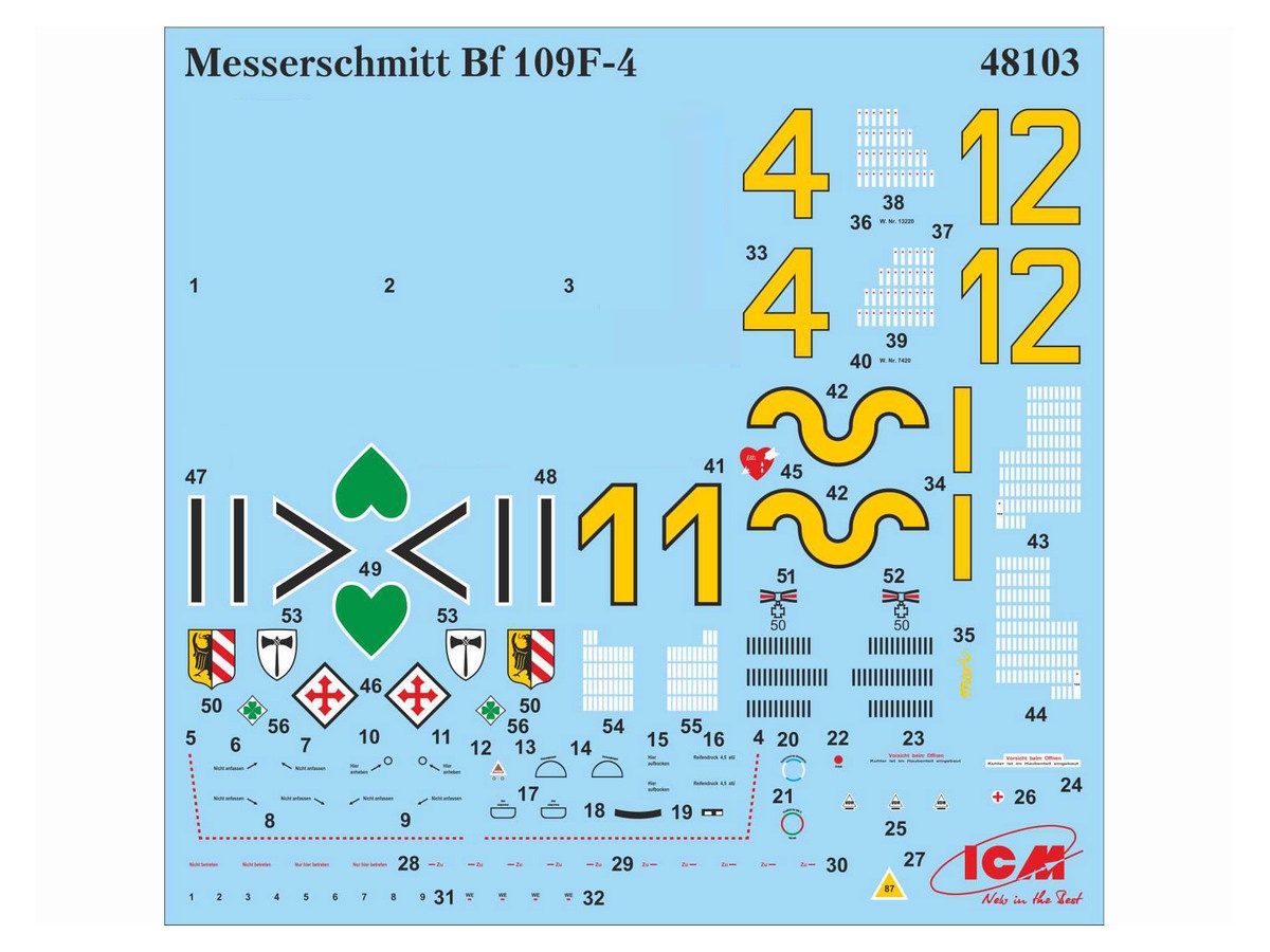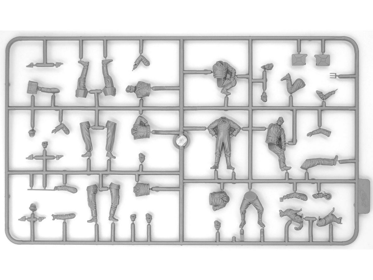 В набор входят 94 детали для сборки модельного набора самолета Bf 109F-4 и 45 деталей для сборки фигурок: старший офицер немецкого Люфтваффе, два пилота, 4 механика времен ВОВ и фигурка собаки.
