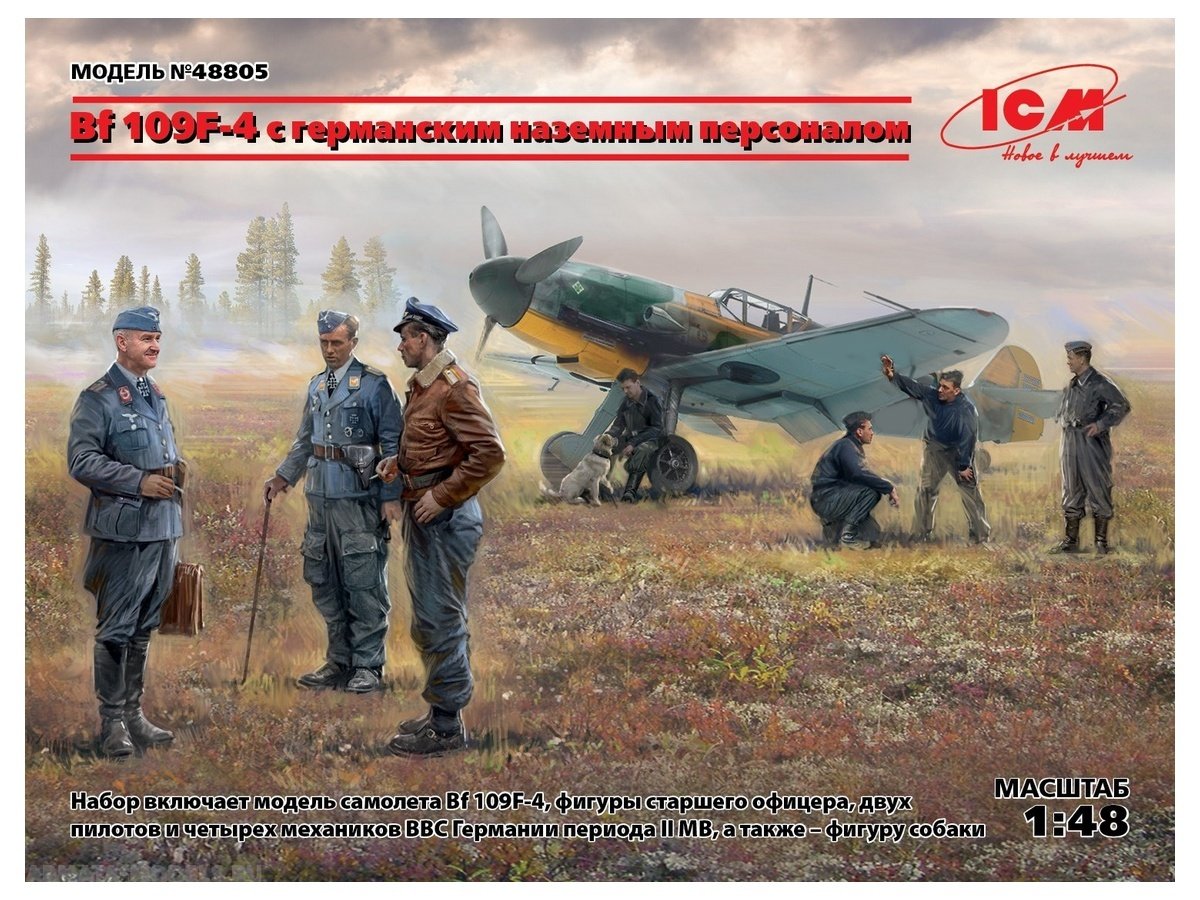 Сборная модель немецкого истребителя Bf 109F-4 с германским наземным персоналом в масштабе 1:48 от ICM.