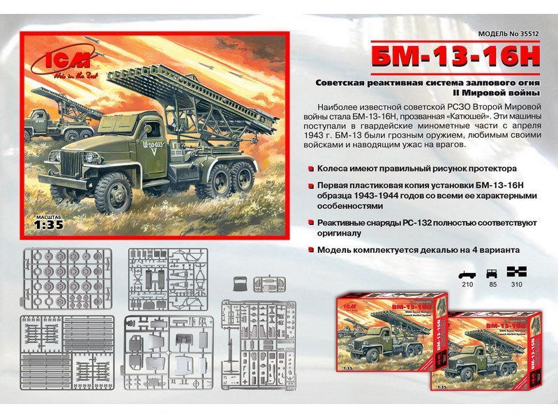 Сборная несущая рама. Сборный детализированный двигатель. Детализированные подвеска и трансмиссия. Прозрачные детали для остекления кабины и стекол передних фар. Проработанная сборная реактивная установка. Точное воспроизведение реактивных снарядов РС-132. Точный рисунок протектора.