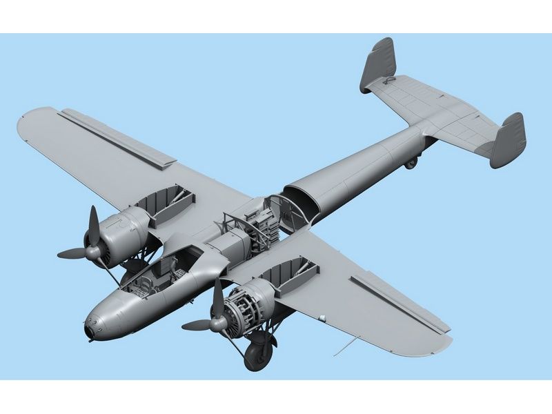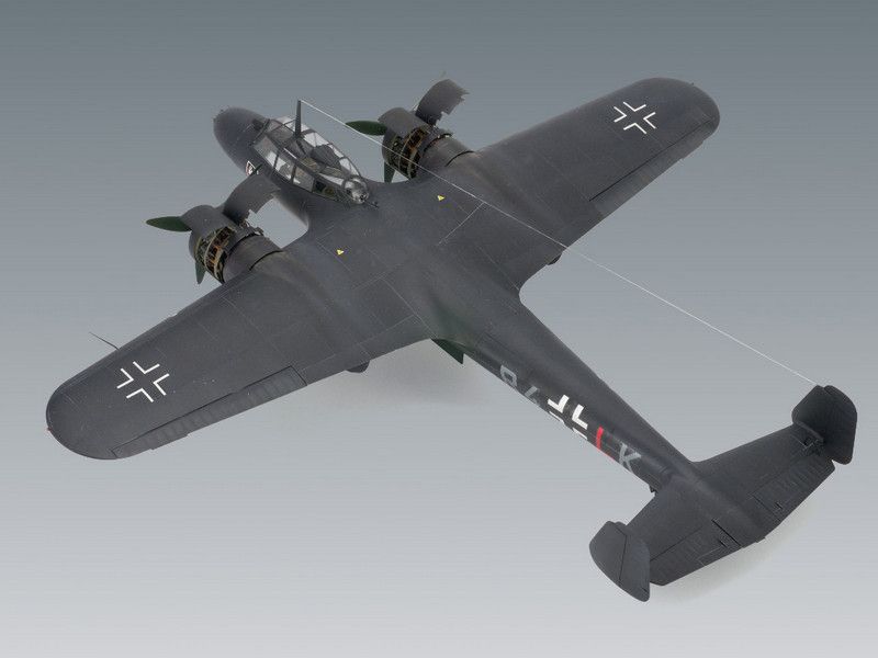 Проработанная внешняя деталировка с конструктивными подробностями, внутренняя расшивка. Детализированная кабина с проработанными местами экипажа, элементами управления и панелью приборов, радиооборудованием, детально проработанные боковые стенки. Детализированные двигатели, проработанные воздухозаборники, выхлоп. Проработанное шасси, створки и ниши шасси. Элероны, рули и стабилизаторы выполнены отдельными деталями. Детали из прозрачного пластика для остекления кабины, посадочных огней. Проработанный бомболюк, створки бомболюка на выбор открыты или закрыты. Декаль с проработанной техничкой для 2 вариантов Люфтваффе.