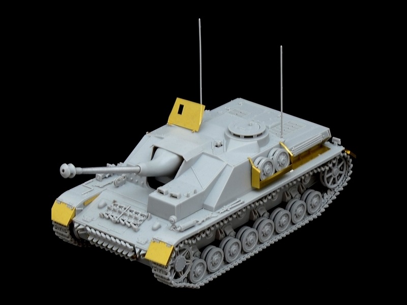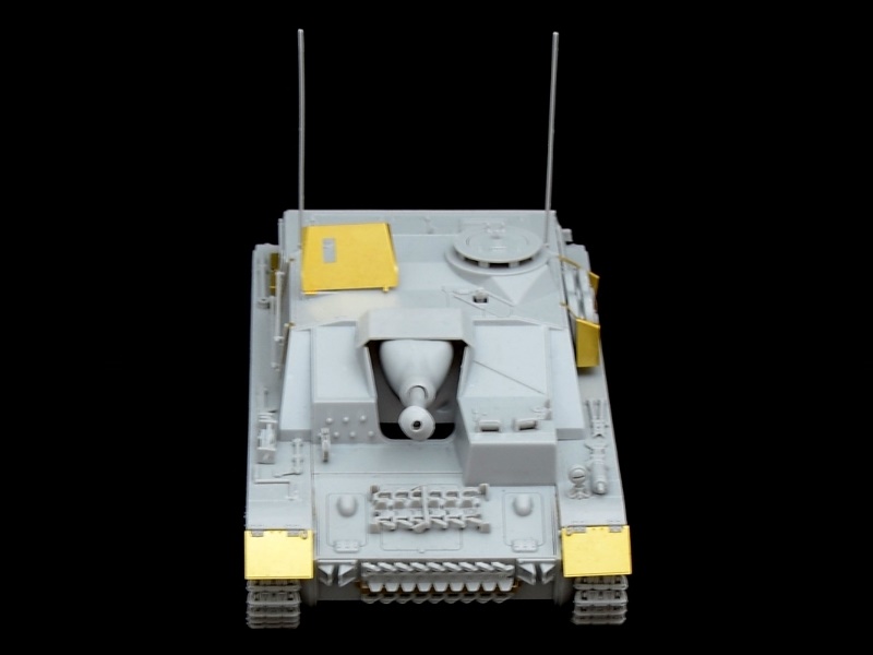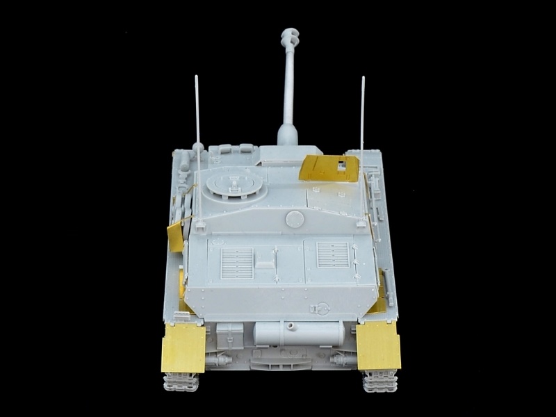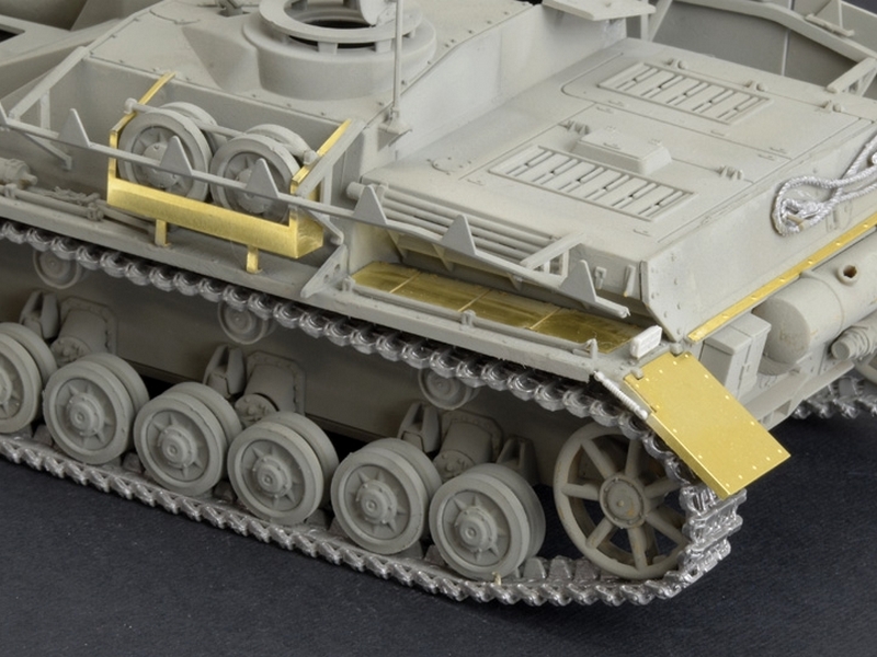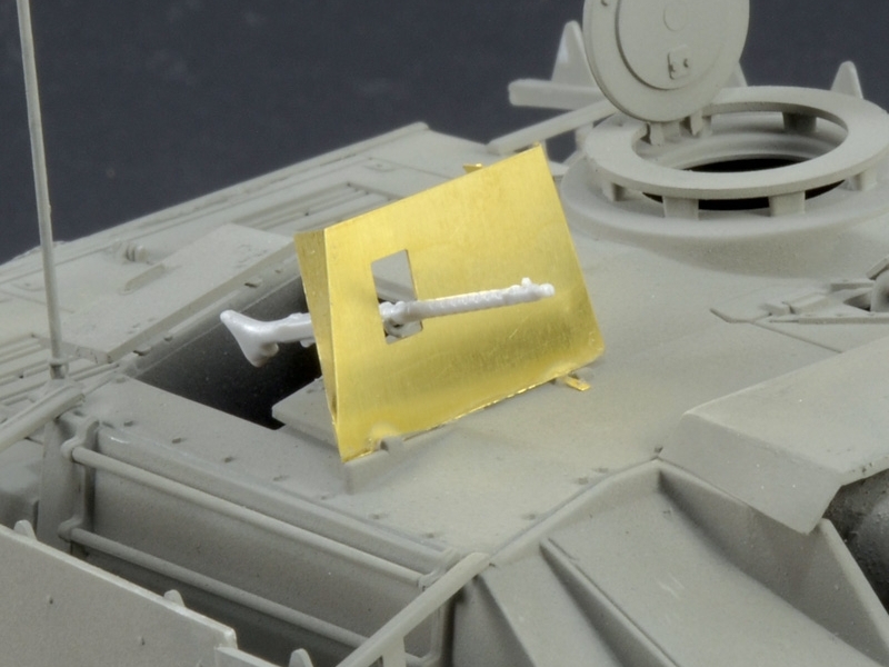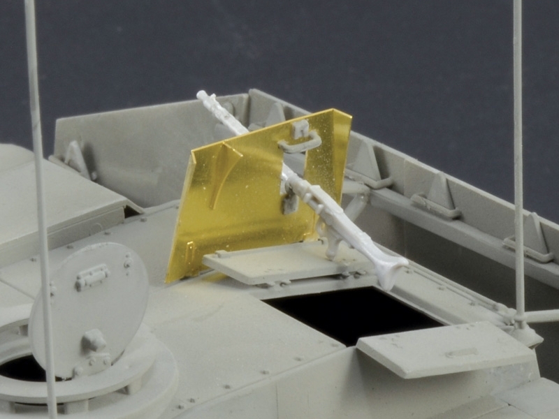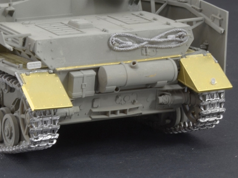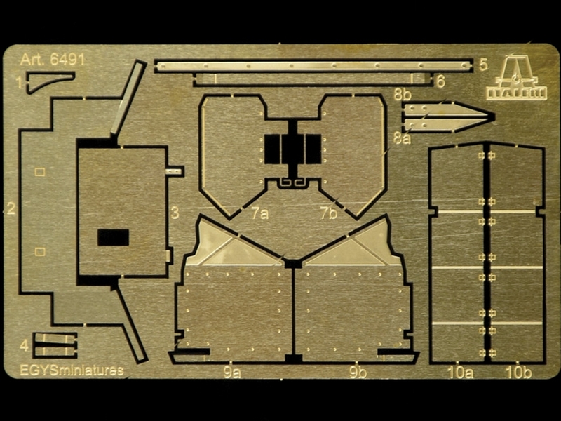 Фототравлёные детали для надгусеничных полок, бронелиста пулемёта, корзины запасных катков и других подробностей.