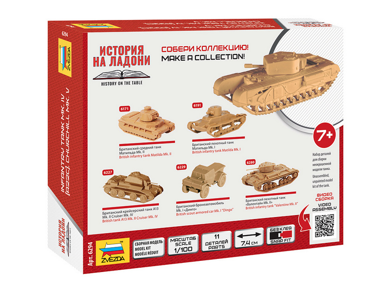 Тяжёлый пехотный танк Mark IV «Черчиль» – наиболее защищённый и массовый английский танк времён Второй Мировой Войны. Машина успела побывать на всех военных театрах Второй Мировой войны, по ленд-лизу поставлялась в СССР. Танк неплохо преодолевал рвы и окопы большой ширины, был сравнительно не сложен в изготовлении и обслуживании. Основным вооружением «Черчиллей» модификаций Mk III и Mk IV являлась 57-мм танковая пушка. На модификации Mark IV Churchill V устанавливалась 95-мм гаубица с боекомплектом на 47 выстрелов.