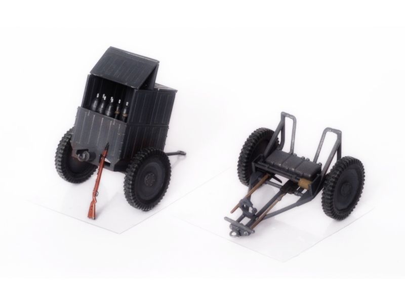 Комплект пластиковых деталей для сборки миномета, 4 фигур, прицепа для перевозки снарядов со снарядами и снарядного ящика.