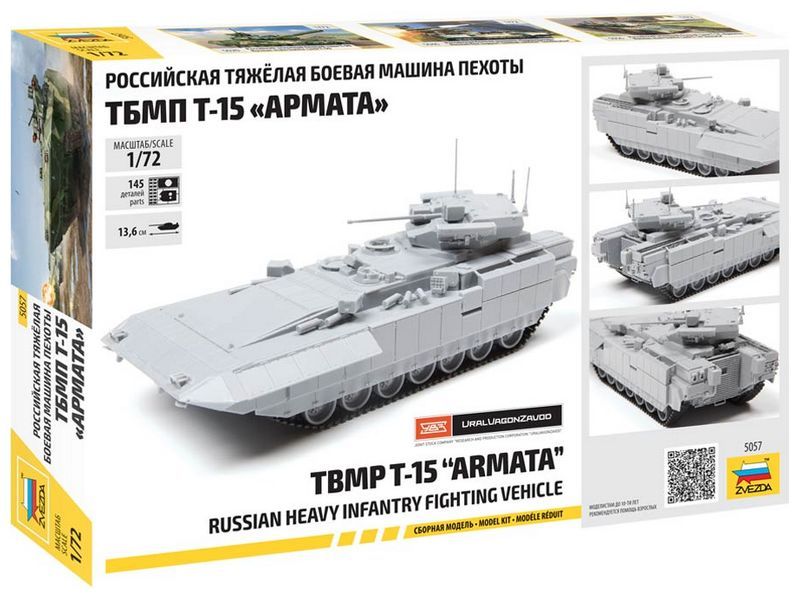 Российская тяжёлая боевая машина пехоты ТБМП Т-15 "Армата" – перспективная российская боевая бронированная машина на базе универсальной гусеничной платформы «Армата». Впервые была продемонстрирована на параде Победы в Москве в 2015 году. БМП Т-15 имеет танковый уровень бронирования и активную защиту Афганит, что позволяет БМП вести бой в одном строю с танками Армата Т-14. Наличие современного ракетного вооружения из ПТРК Корнет и зенитной пушки позволяет эффективно обстреливать как наземные, так и воздушные цели. На сегодня это самая высокозащищённая БМП в мире.