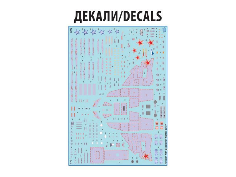 Декаль для 3 вариантов окраски: Т-50-9 восьмой лётный прототип Су-57 первый полёт в ноябре 2016 года. Т-50-11 десятый лётный прототип Су-57 принятый за эталон серийного Су-57 первый вылет в августе 2017 года, Су-57 предполагаемый вид серийного самолета.