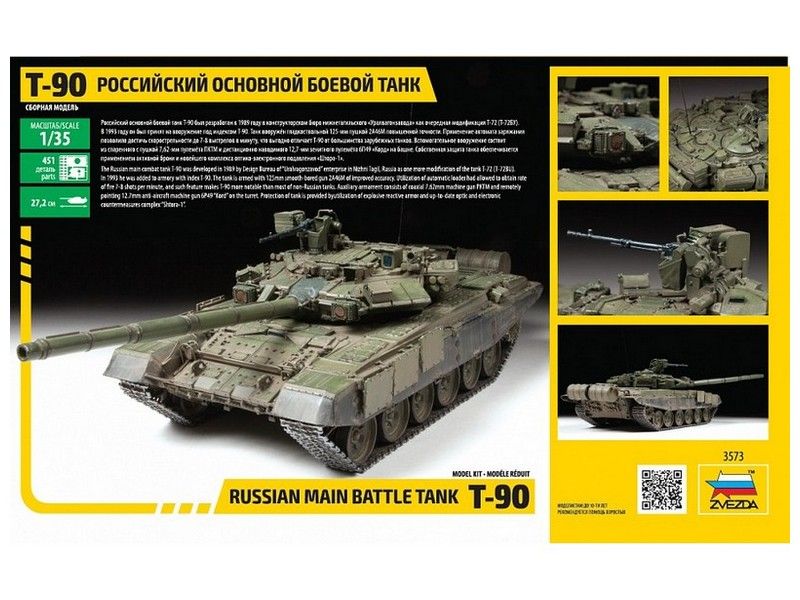 Российский основной боевой танк Т-90 был разработан в 1989 году в конструкторском бюро нижнетагильского «Уралвагонзавода» как очередная модификация Т-72 (Т-72БУ). В 1993 году он был принят на вооружение под индексом Т-90. Танк вооружён гладкоствольной 125-мм пушкой 2А46М повышенной точности.