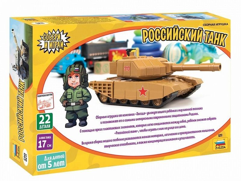 Детские сборные игрушки от компании «Звезда» увлекут вашего ребёнка в мир военной техники и познакомят его с самыми интересными современными защитниками Родины. С помощью ярких пластиковых элементов, которые легко соединяются между собой, ребёнок сможет собрать «Российский танк», чтобы играть с ним на улице или дома.