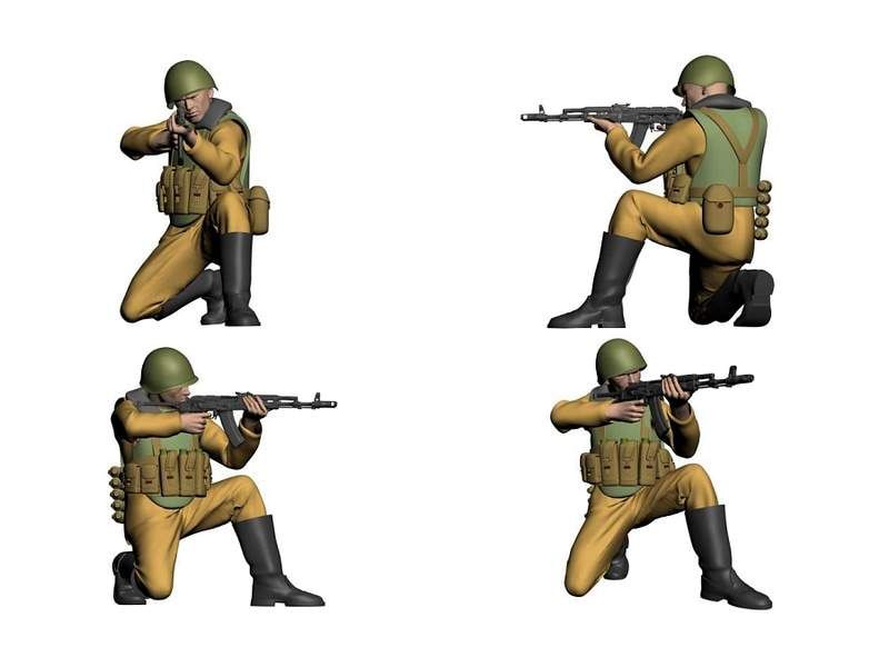 В наборе 6 фигур с различным вооружением: автоматы Ак-74, пулемет РПК, снайперская винтовка Драгунова.