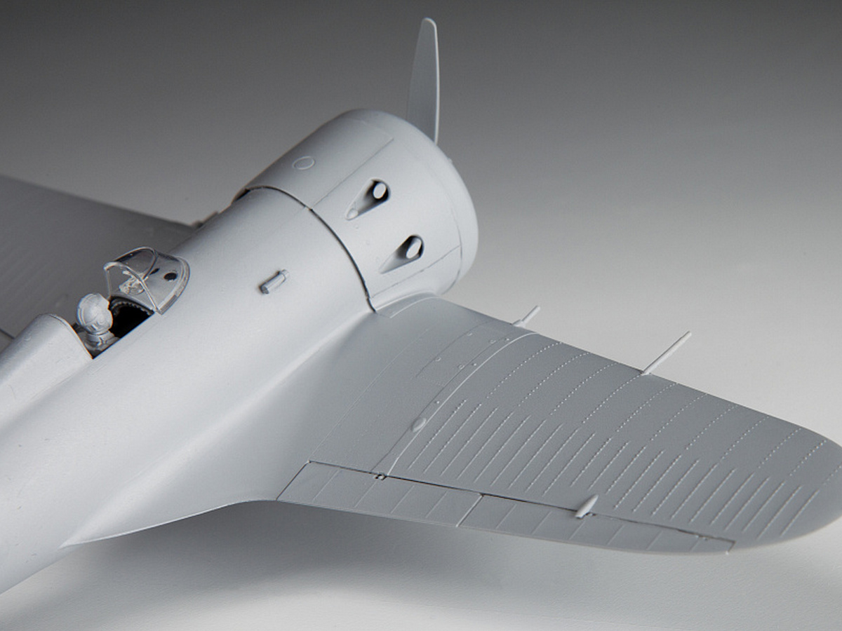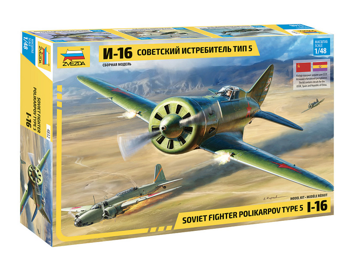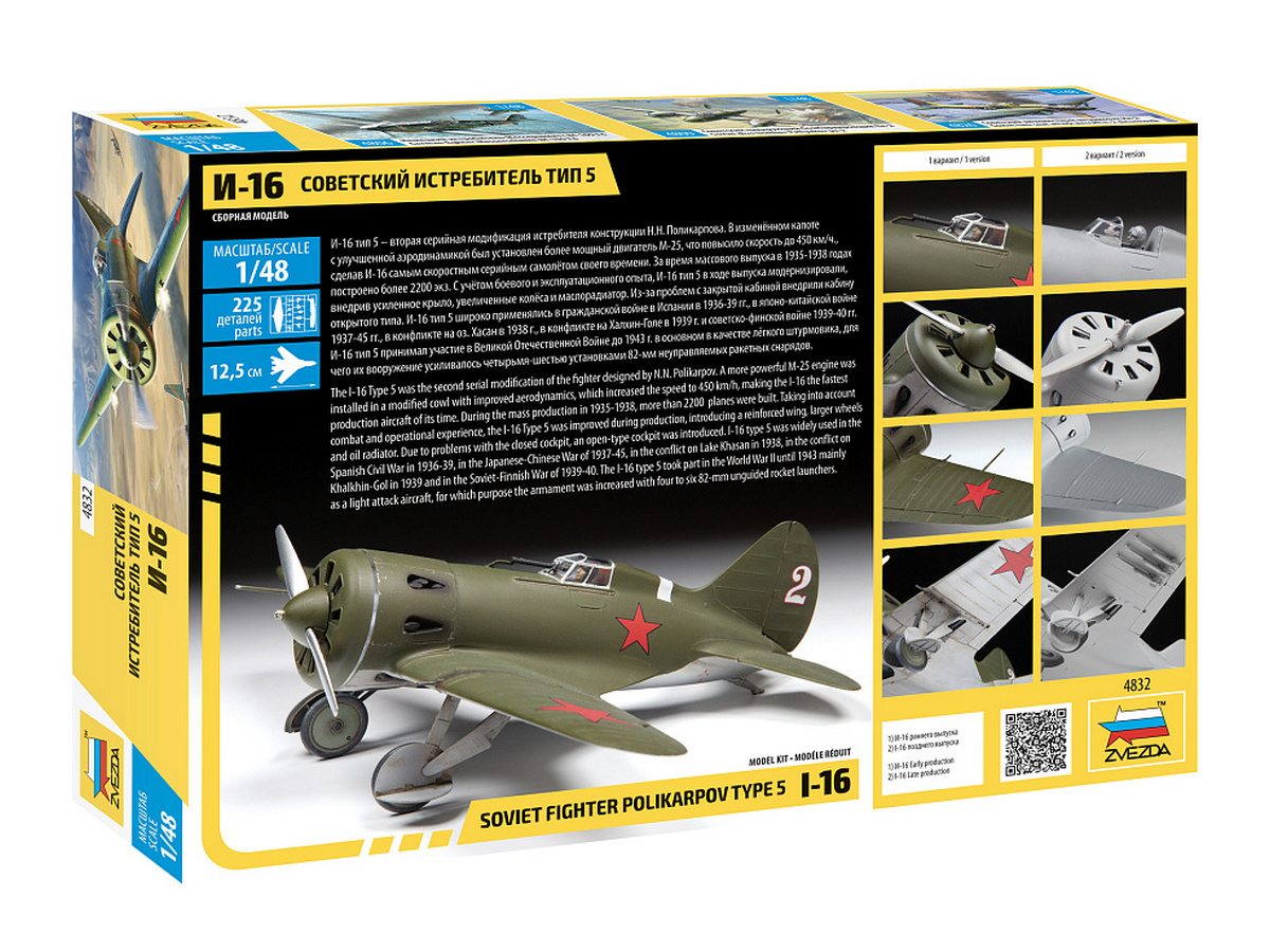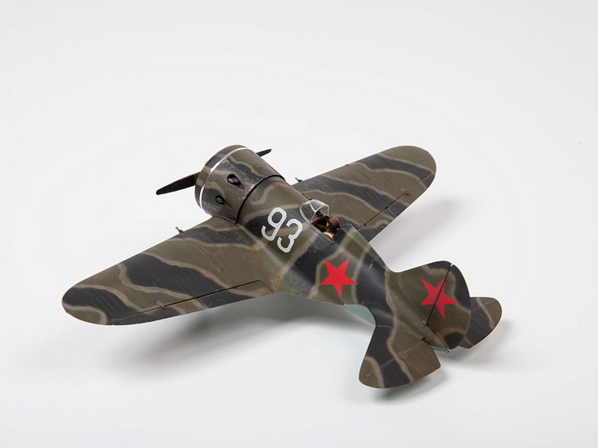 И-16 тип 5 – вторая серийная модификация истребителя конструкции Н.Н. Поликарпова. В измененном капоте с улучшенной аэродинамикой был установлен более мощный двигатель М-25, что повысило скорость до 450 км/ч., сделав И-16 самым скоростным серийным самолетом своего времени. За время массового выпуска в 1935-1938 годах построено более 2200 экз. С учетом боевого и эксплуатационного опыта, И-16 тип 5 в ходе выпуска модернизировали, внедрив усиленное крыло, увеличенные колеса и маслорадиатор. Из-за проблем с закрытой кабиной внедрили кабину открытого типа.