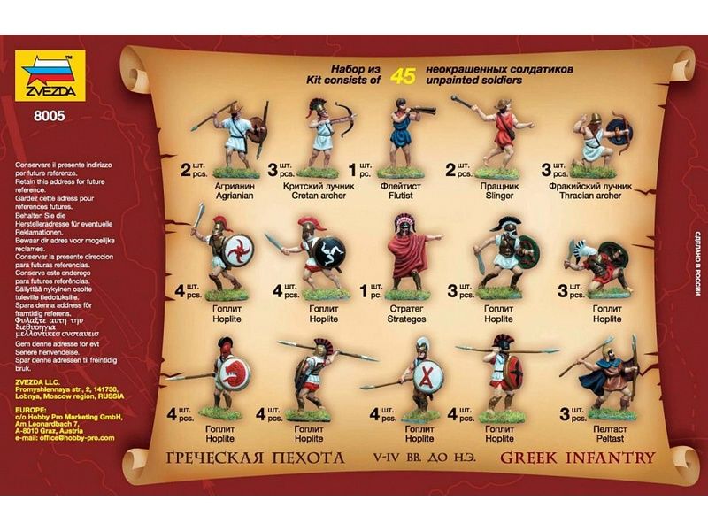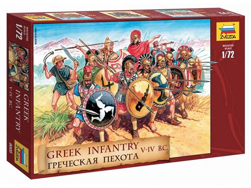 Греческая наемная пехота была снаряжена по традиционному спартанскому образцу: бронзовые гоплитские щит и шлем, однако панцирь и поножи отсутствовали. Воины были вооружены обычными для пехоты копьем и мечом и носили красную эксомиду (exotnis) - хитон со спущенным правым рукавом.