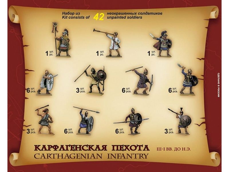 Основой карфагенского войска была пехота, в которую входили ливо-фини- кийцы - народность, сформировавшаяся в результате колонизации ливийских земель финикийцами. Ливийско-финикийская пехота была вооружена по эллинистическому образцу. Тяжелая пехота носила мускульные кирасы и кольчуги, шлемы греческого эллинистического типа, часто с гребнем без конских волос и круглые греческие щиты. Вооружалась тяжелая пехота копьями и мечами. Воины легкой пехоты носили обыкновенные неподпоясанные тоги, овальные римские щиты и вооружены были метательными копьями и мечами. На острове Крит карфагенская армия набирала хороших пращников, которые поражали противника на расстоянии 120-160 шагов.