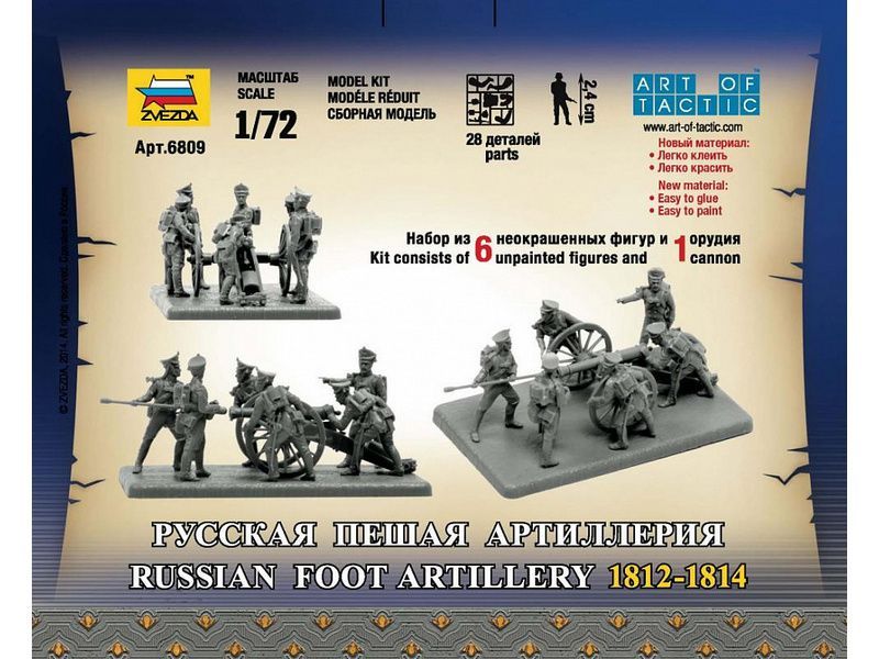 Комплект пластиковых деталей для сборки 6 неокрашенных фигур и орудия.