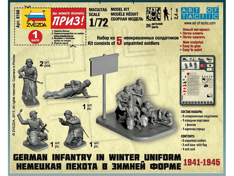 Набор «Немецкая пехота в зимней форме» прекрасное пополнение серии мини-наборов игровой системы Art of Tactic. Моделистов порадует высокая детализация и простота сборки. Набор войдет в грядущую военную настольную игру «Битва за Москву». Данный мини-набор позволит расширить игру новыми отрядами и разнообразить игровой процесс.