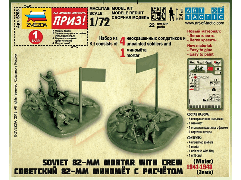 Невысокая цена и простая сборка. Историческая справка: Советская артиллерия к зиме была хорошо подготовлена. Помимо тёплого обмундирования и белой краски для маскировки, многие миномётные части получили санки для транспортировки миномётов и снарядных ящиков. Это позволяло быстро перемещаться во время боя, используя тактику кочующих батарей, для того, чтобы создать у противника, видимость большого количества своей артиллерии.