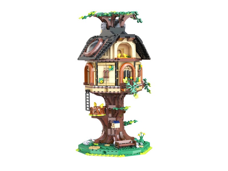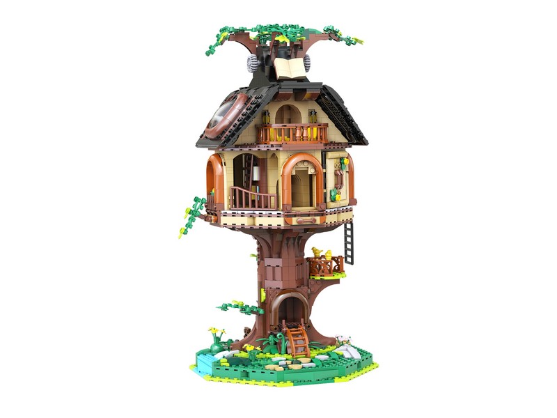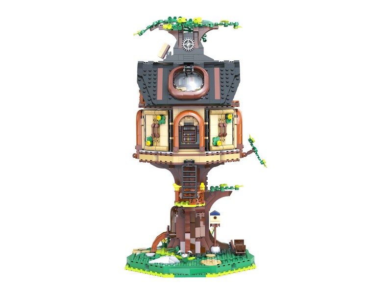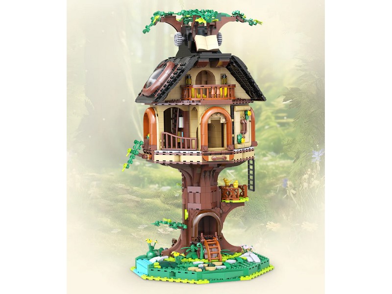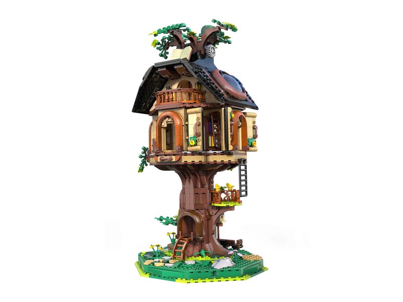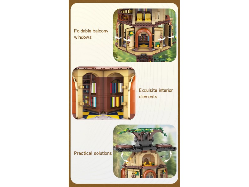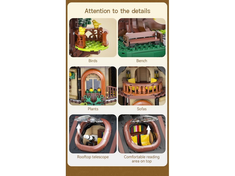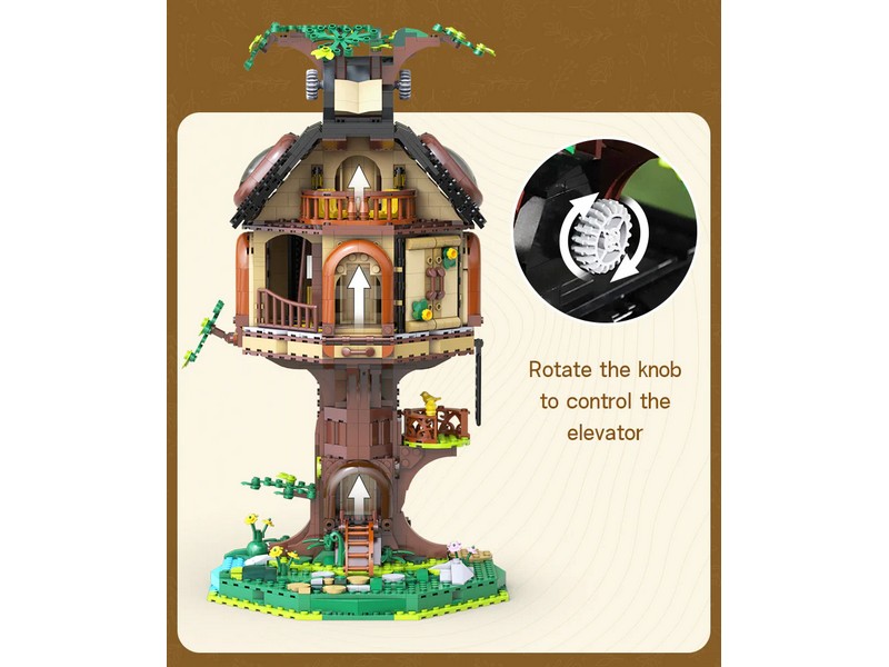 Конструктор Библиотека на дереве — это больше, чем просто статичная модель. На первом этаже внутри здания расположена библиотека с книжными полками , лестницами и окнами, а на втором этаже – уютный читальный зал с телескопом и дополнительными книжными полками. Крышу и круглые окна можно вручную открыть, чтобы увидеть читальный зал и живописную зону внутри. Боковые стены также можно открыть. Повернув кнопку наверху, лифт может двигаться вверх и вниз, позволяя вам исследовать каждый уголок домика на дереве.