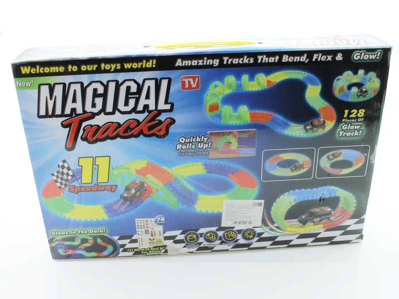 - Части трассы Маджик Трек светятся в темноте. Заряжайте трассу на дневном свету и играйте в темноте!