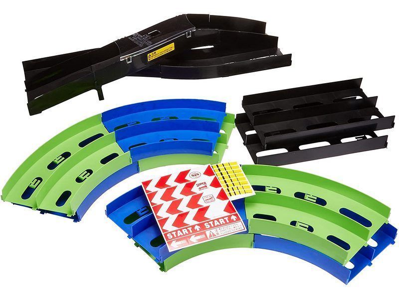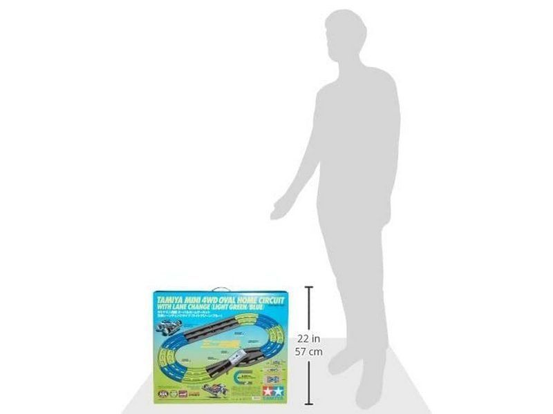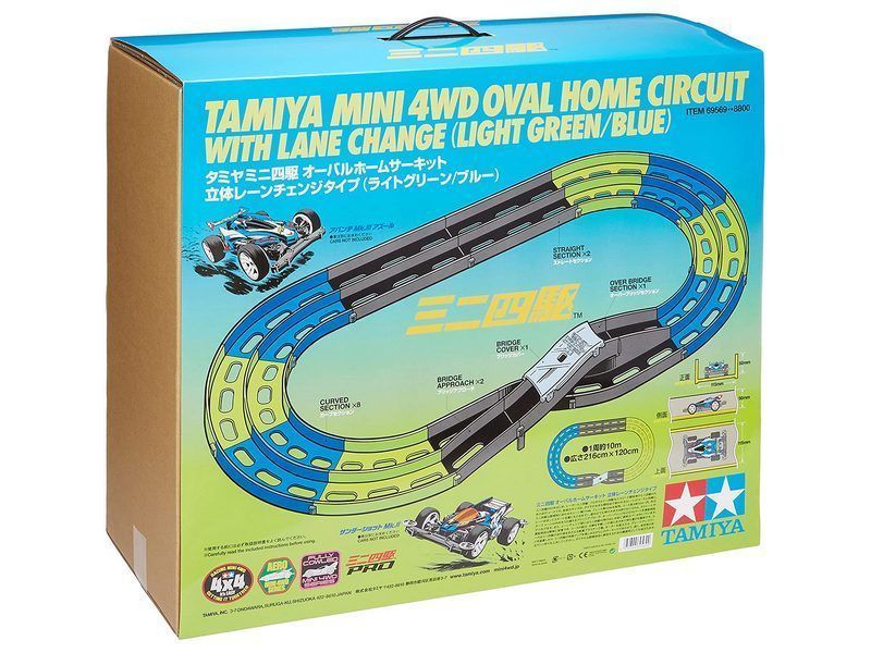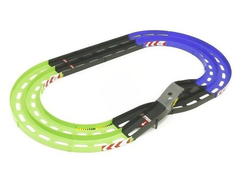 Трек на 2 дорожки со сменой полосы движения от Tamiya. 14 секций зеленого и синего цветов. Секция смены полосы движения снабжена прозрачной крышкой, которая предотвращает вылет автомобиля с трассы.