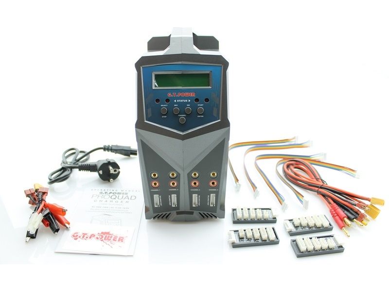 G.T.Power X4 - полнофункциональное цифровое интеллектуальное многофункциональное зарядное/разрядное устройство со встроенной балансировкой. Оснащено четырьмя индивидуальными схемами, позволяющими одновременно заряжать 4 батареи независимо от типа батареи и количества элементов. Работает с батареями NiCd/NiMH, LiPo/LiFe/LiIon/LiHV, Pb.